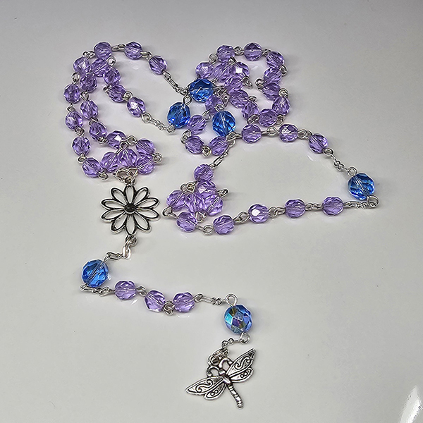 The finished necklace features a delicate, feminine design with soft sparkle and a touch of whimsy. Clear faceted beads are accented with vibrant blue tones, leading to a charming focal element and a graceful drop that adds movement and visual interest. This class is perfect for anyone looking to build confidence while creating a stylish, wearable piece.