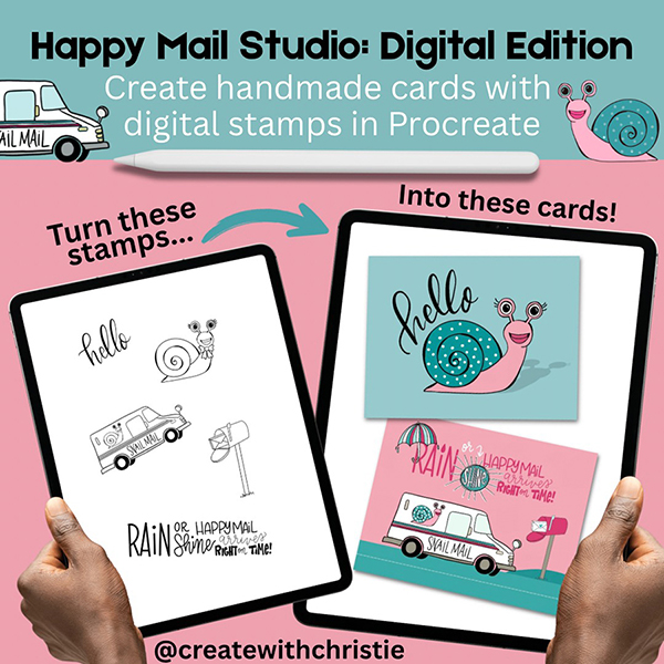 Happy Mail Studio: Digital Edition: In this creative digital workshop, Christie will share how to design handmade-style greeting cards using digital stamps in Procreate. You’ll learn how to start with simple line drawings and black outline images, then transform them into beautifully colored designs ready for card making. Christie will walk through easy techniques for coloring, shading, and building dimension, showing how digital tools can create the look and feel of traditional handmade cards. This class is beginner-friendly and perfect for anyone interested in combining digital illustration with card-making creativity.