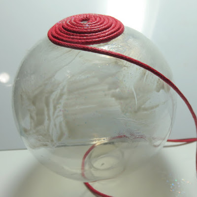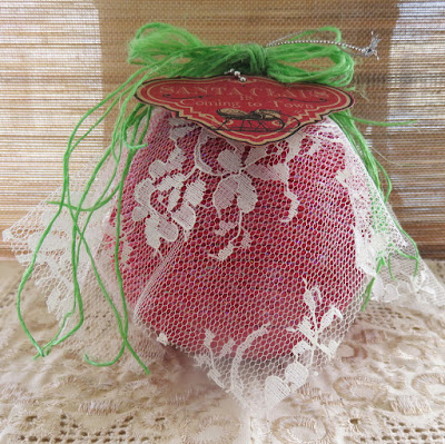 I altered the Dollar Tree $1 plastic ornament with a whole pack of red cord, some lace, some burlap threads, a paper tag and a lot of glue and mess. The final result is lovely and the colors can be changed to another, non-traditional ones, too.