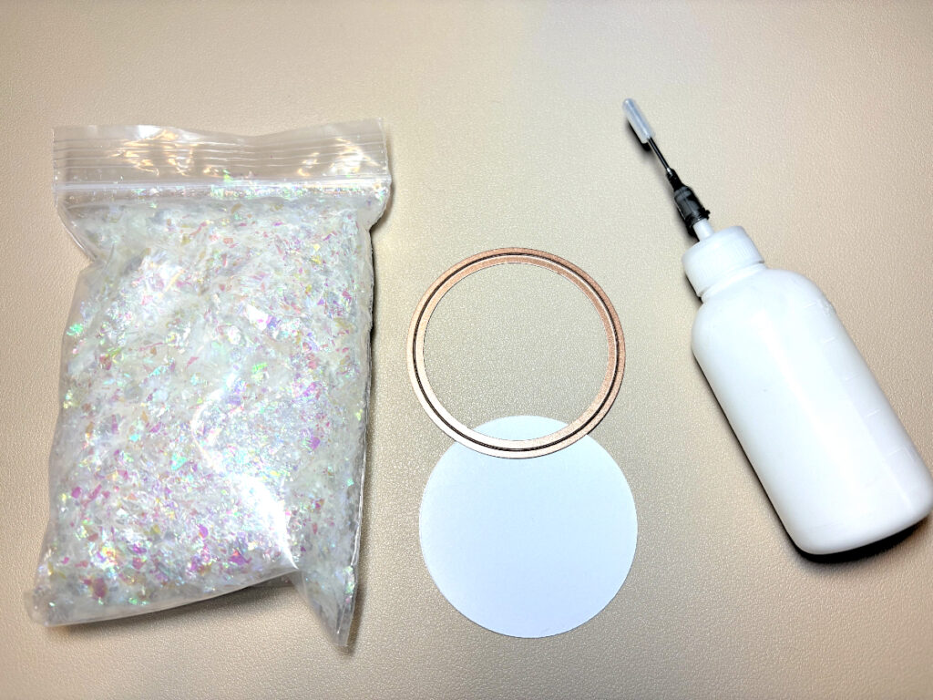 Die cut four 2 3/4″ circles from White cardstock and adhere them together with glue. Adhere the iridescent confetti to the circles until it’s covered.