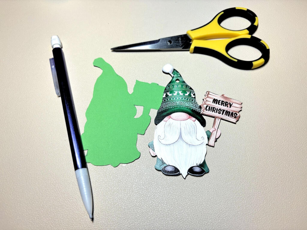 Trace the wood gnome onto a piece of Green cardstock and cut it out. Next, adhere the wood gnome to the cutout.