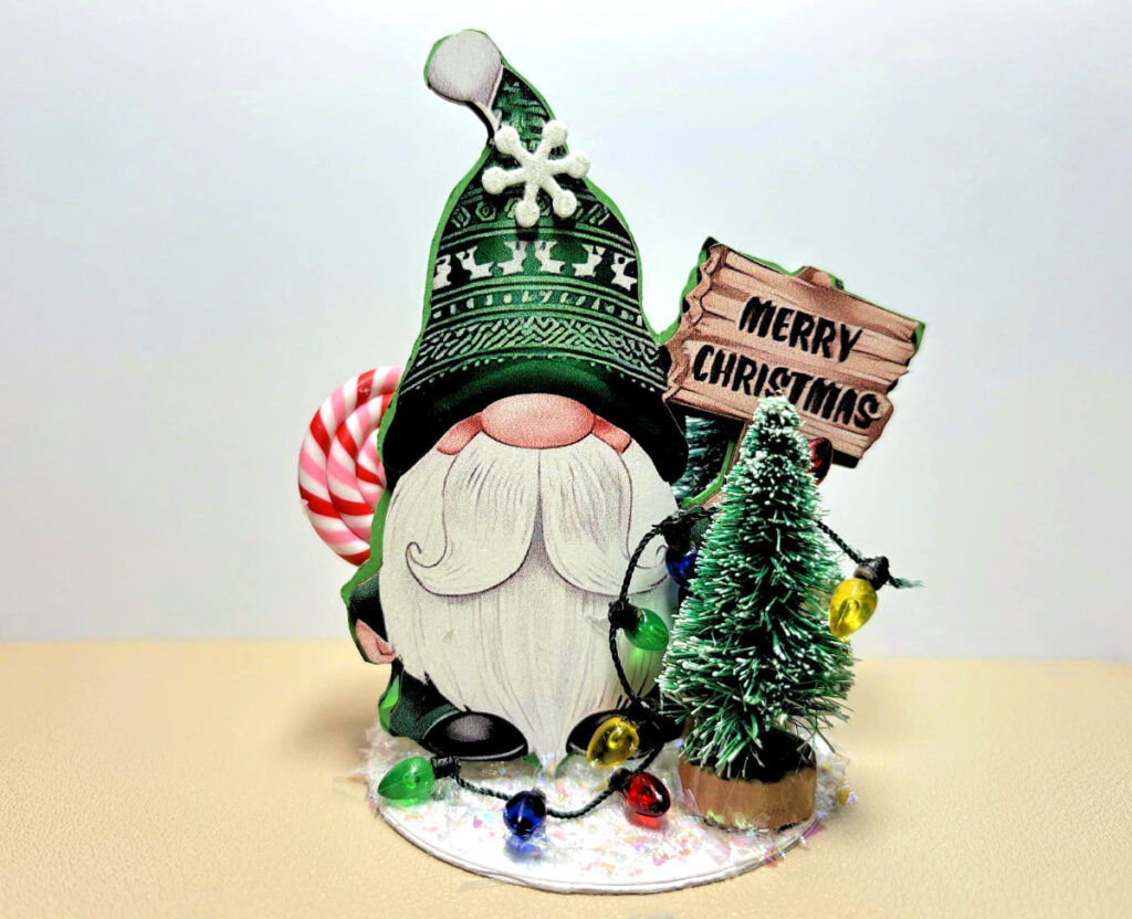 Using a glue gun, adhere the gnome, tree and some lights to the base. Attach a snowflake sticker to the gnomes hat.