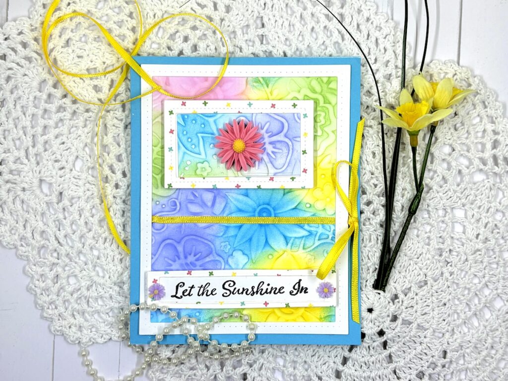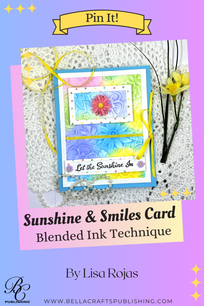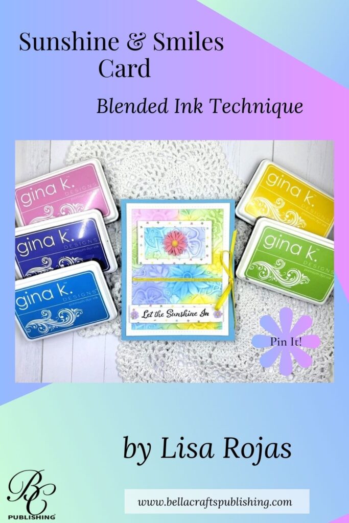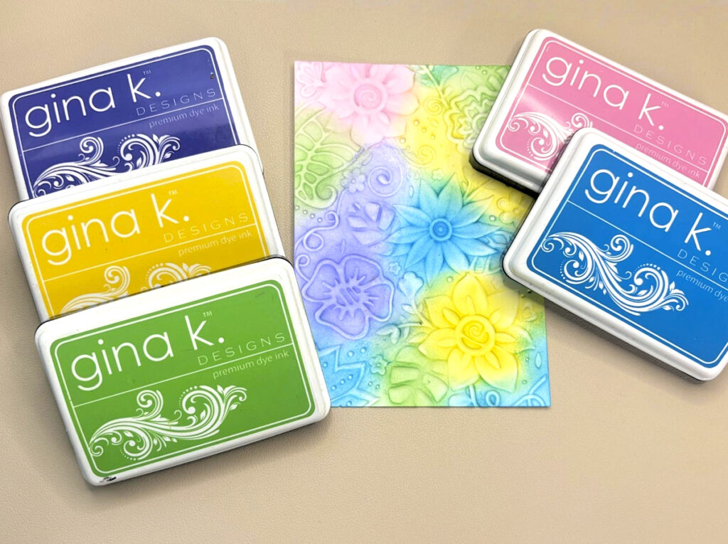 If you’re looking for a quick card to create, this one’s for you! The blended ink technique together with an embossing folder and these beautiful inkpads for Gina K. Designs, is sure to bring sunshine and a smile to someone you love.