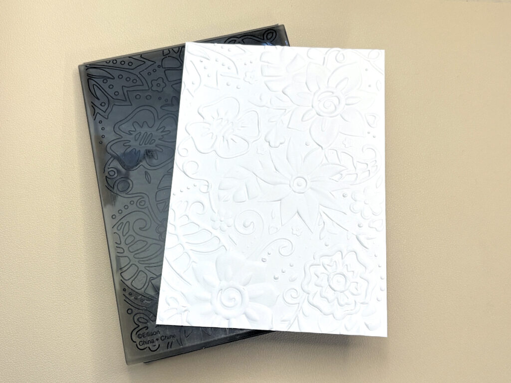 Cut a piece of White cardstock 4 1/4″ x 5 1/2″. Place it into the embossing folder and run it through a die cutting machine.