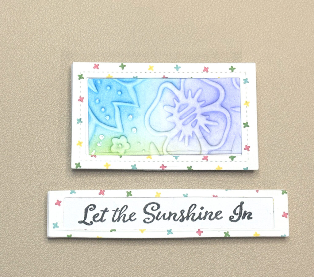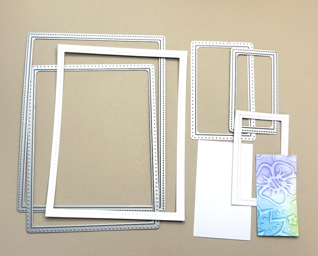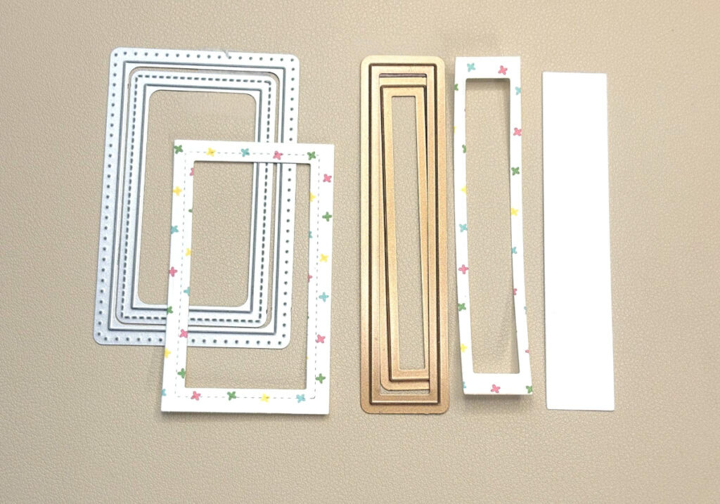 Die cut the two smaller frames 1 3/4″ x 3″ and 1/2″ x 3 7/8″ from patterned paper. Next, cut a rectangle 1/2″ x 3 7/8″ from White cardstock.