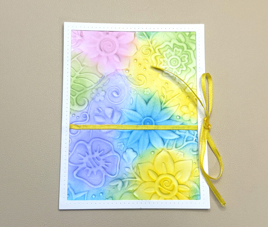 Wrap the Yellow ribbon around the embossed cardstock and tie a bow as shown. Adhere the frame to the cardstock.
