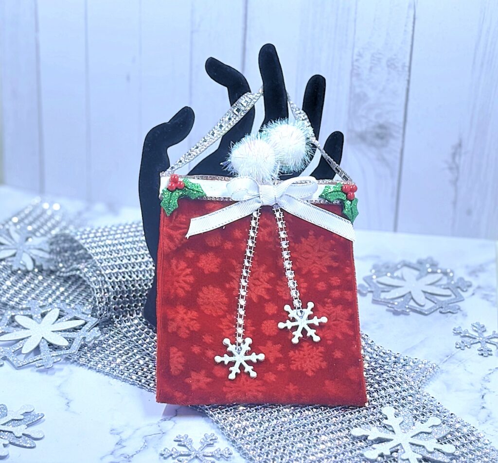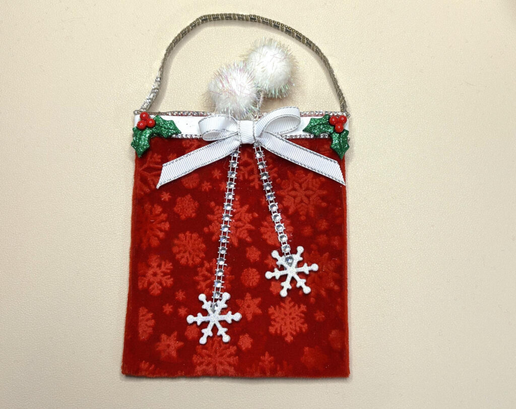 To finish, cut one strip of rhinestones 3 1/2″ and a second one 2 1/2″. Attach the snowflakes to each end. Adhere them to the top of the bag. Adhere the glitter pom poms, the two holly buttons and the bow to the top of the bag as shown.